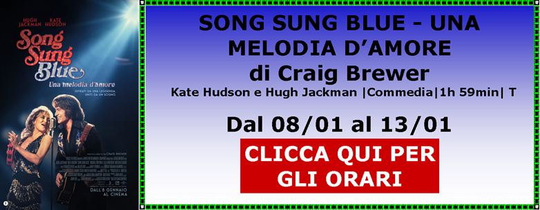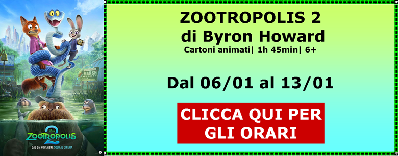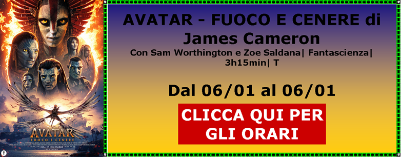Dal 06/01 Proiettiamo AVATAR - FUOCO E CENERE UN TOPLINO SOTTO L’ALBERO ZOOTROPOLIS 2 PRIMAVERA NORIMBERGA BUEN CAMINO SPONGEBOB - UN’AVVENTURA DI PIRATI SONG SUNG BLUE - UNA MELODIA D’AMORE L’AMICO FEDELE |