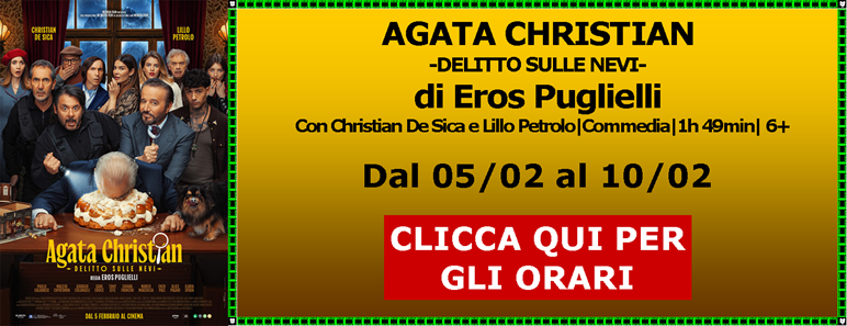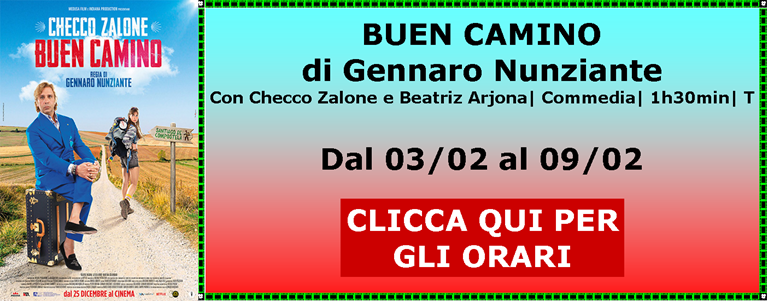 Dal 05/02 Proiettiamo BUEN CAMINO LA GRAZIA AGATHA CHRISTIAN - DELITTO SULLE NEVI LAVORERAMO DA GRANDI STRAY KIDS - THE DOMINATE EXPRIENCE UNA SCOMODA CIRCOSTANZA |