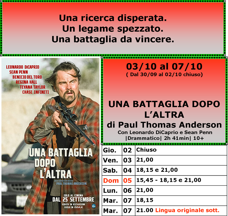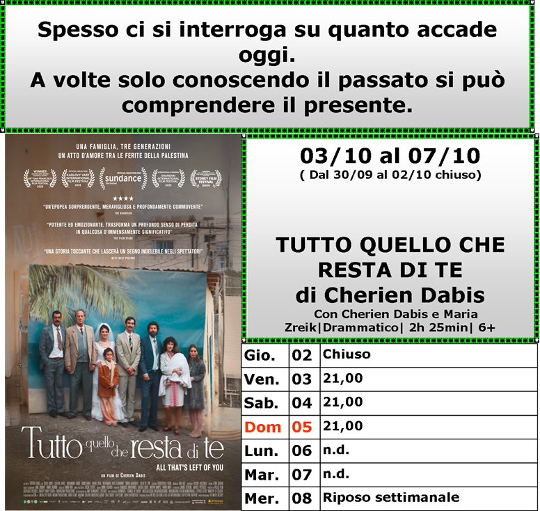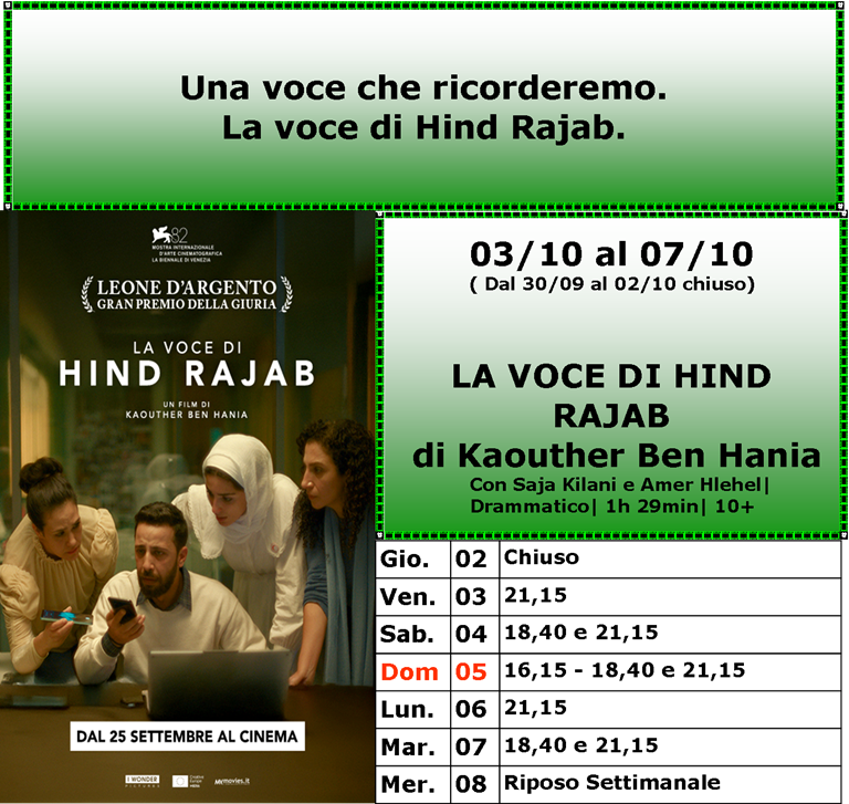 Dal 25/09 Proiettiamo UNA BATTAGLIA DOPO L’ALTRA LA CASA DELLE BAMBOLE DI GABBY LA VOCE DI HIND RAJAB TUTTO QUELLO CHE RESTA DI TE SCHOOL OF LIFE |