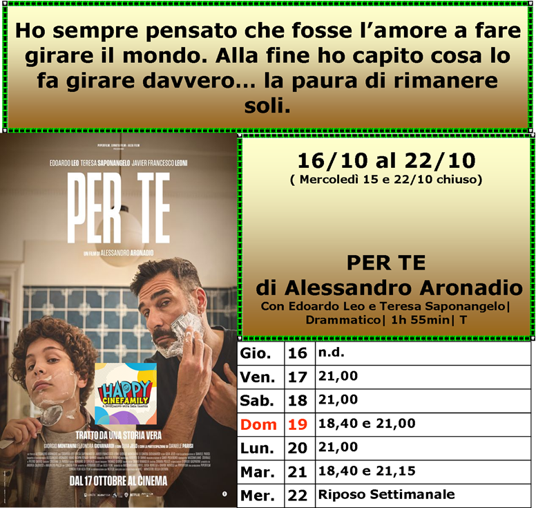 Per i film, italiani ed europei, contrassegnati con il logo HAPPY CINEFAMILY SCONTO DI €URO 2,50 A BIGLIETTO RISERVATO ALLE FAMIGLIE composte da due adulti e un ragazzo, con età inferiore a 12 anni. Lo stesso sconto di Euro 2,50 si applica a ciascun ulteriore ragazzo del medesimo gruppo famigliare di età inferiore a 12 anni. Fino al 31/12. |